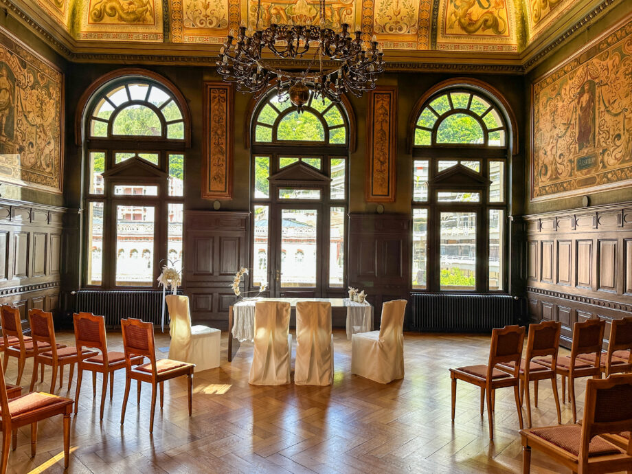 Wer sich ein stilvolles, historisches Ambiente für die eigene Hochzeit wünscht, ist im Kuppelsaal des Forum König-Karl-Bads genau richtig. Das prächtige Badegebäude, benannt nach König Karl I. von Württemberg, zählt zu den eindrucksvollsten seiner Art in Baden-Württemberg. Zahlreiche originale Wandgemälde, Glasmalereien, Skulpturen, kunstvolle Fliesen und Holzvertäfelungen aus der Erbauungszeit verleihen dem Saal ein unvergleichlich romantisches Flair.